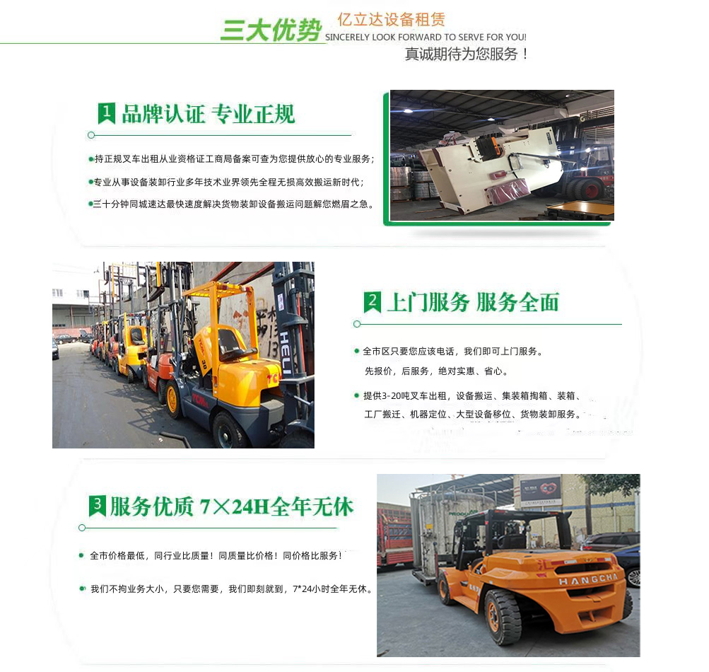 亿立达设备租赁有限公司是工商局准许的天津商业大学专业叉车出租公司,公司本着诚信、服务、效率、创新的经营理念,用精湛的技术,真诚的服务,为众多客户提供优质的服务,同时获得信赖与支持。专业提供天津商业大学3-20吨叉车出租、叉车租赁、设备搬运、集装箱掏箱装箱、机器移位定位、货物装卸、工厂搬迁、安全可靠,收费透明,价格便宜,随叫随到,24小时上门服务!本公司叉车吊车师傅对各种设备搬运装卸都有深刻探讨和研究。很多的疑难设备搬运,通过我公司的叉车师傅都能迎刃而解。对各种进口设备、国产机器、大型设备搬迁、高难度搬迁、各种精密仪器、医疗设备、科研设备等都能搬运; 提供全市 24 小时上门装卸搬运服务。同时提供厂房搬迁服务。 ...